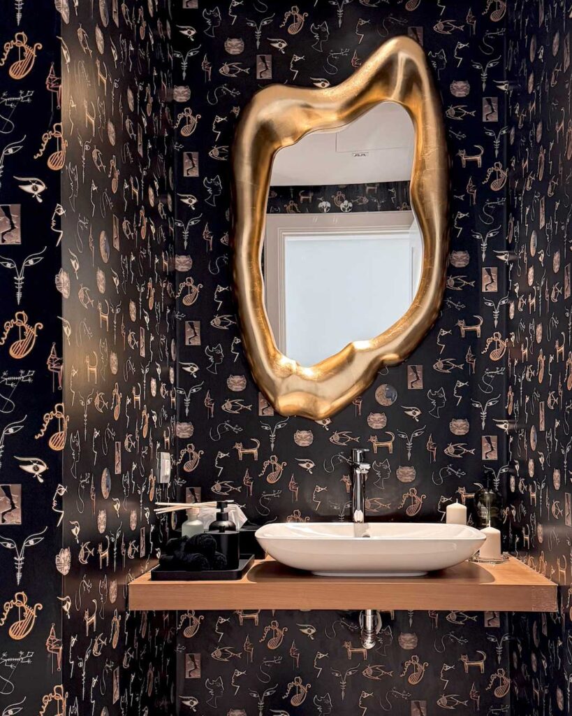 La vivienda cuenta con varios baños, todos ellos con acabados de alta calidad, destacando el uso de espejos grandes, grifería moderna y detalles en tonos plateados y negros que aportan sofisticación. Uno de ellos, el Aseo, lo hemos dejado con gran personalidad. La clave del diseño esta en la combinacion de elementos artisticos y sofisticados que lo convierten en una joya dentro del hogar, un ejemplo de cómo el diseño audaz y el arte pueden transformar un Aseo en una experiencia sensorial unica.